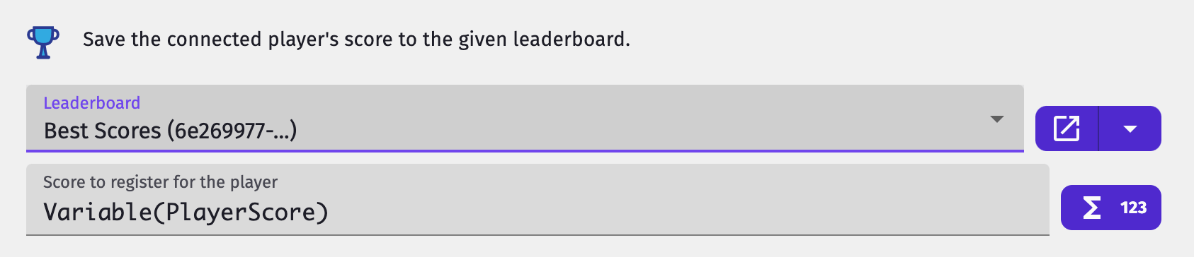 • Once it is done, you can either select the leaderboard you want to send the score to, or use an expression to define the unique id of the leaderboard (if it is stored in a scene variable for instance).