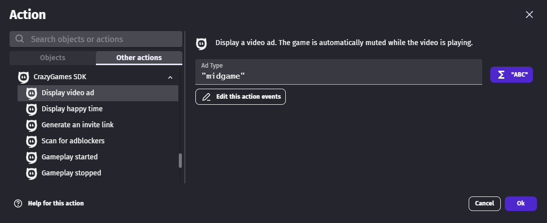 A video ad filling the entire game screen can be displayed using the Display video ad action. An ad can either be "midgame" or "rewarded".