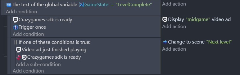 CrazyGames games must be playable even if an ad blocker exists. To avoid blocking in your game, you can use the Ad blocker is detected condition, or use it to restrict certain parts of your game while warning your players that by deactivating their blocker they will be able to access the rest of the content.