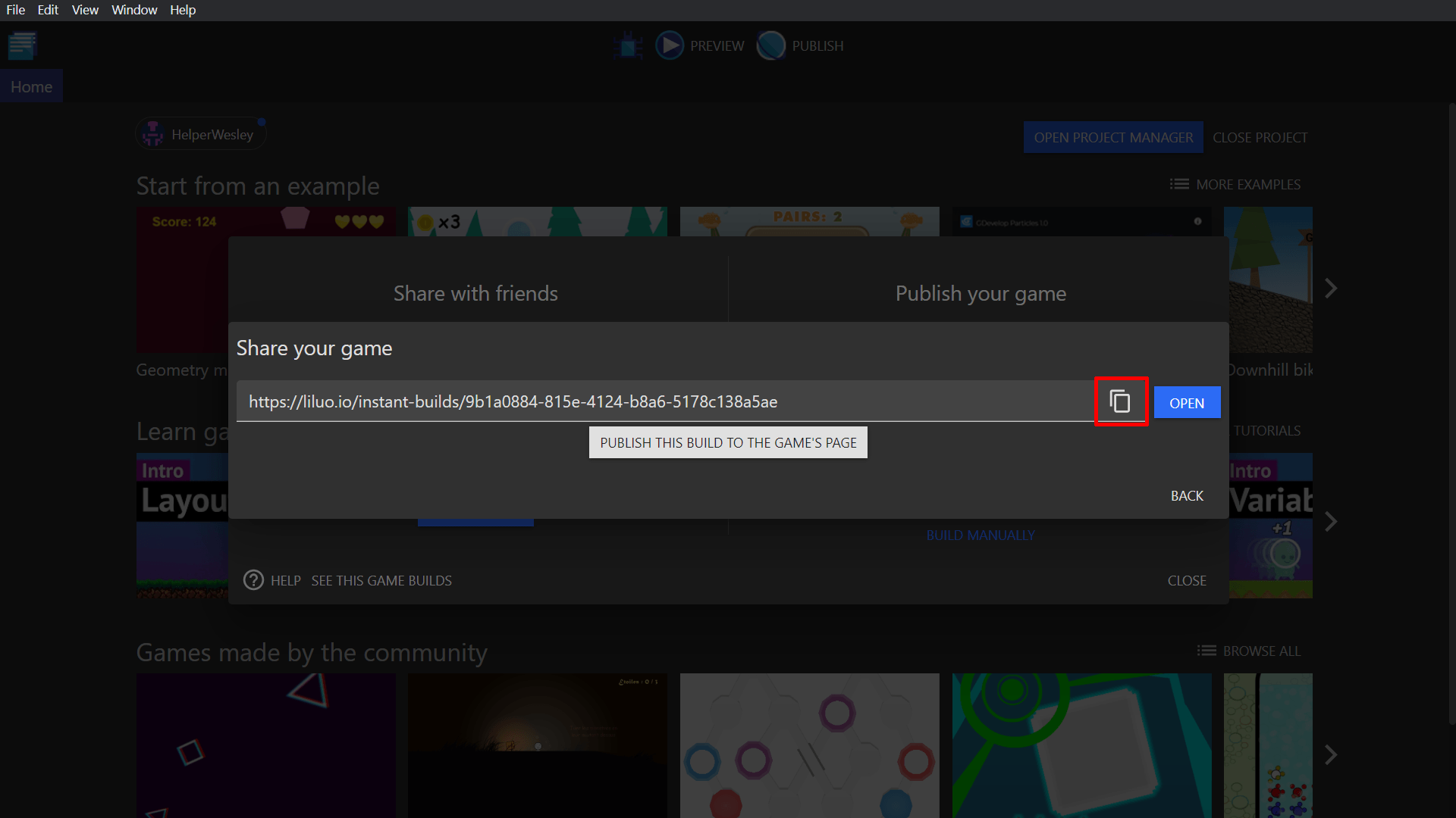 To post your game publicly on gd.games, click on the "publish this build to the game's page" button below the link. gd.games is GDevelop's game hosting platform, where free games created with GDevelop can be shared and played.