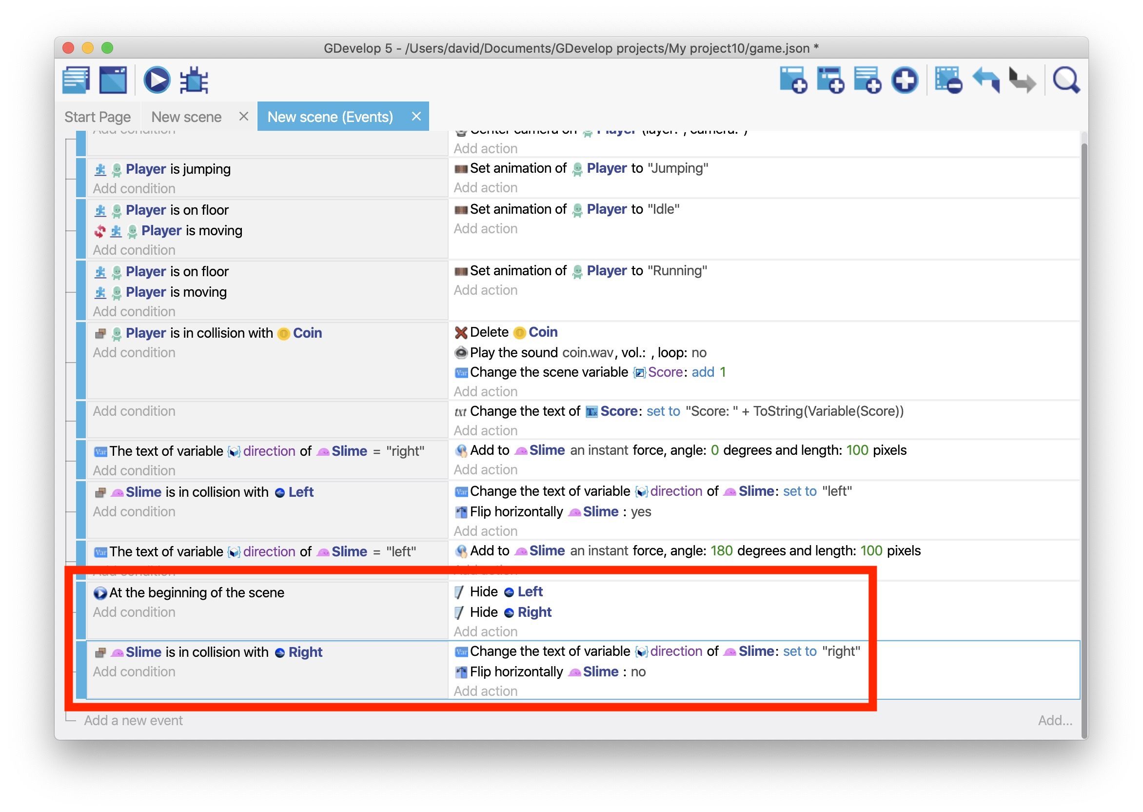 2. Add a Collision condition that checks if the "Slime" object is colliding with the "Left" object.